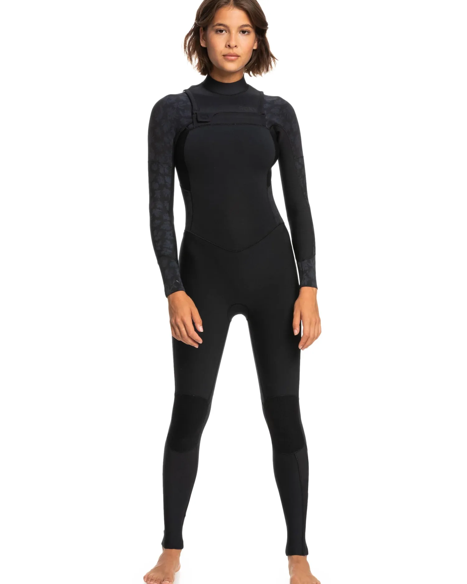 Embrace the swell in this ROXY full wetsuit with a solid body and printed side panels. The partially recycled polyester-elastane blend and WarmFlight ® thermal lining pack in heat and total comfort, while the flexible StretchFlight neoprene and Supratex knee pads provide protection and unrestricted movement for all day sessions. The chest zip entry and glideskin neck seal offer a snug, performance fit, so you can focus on catching the perfect wave. Featured here in the Black colorway.