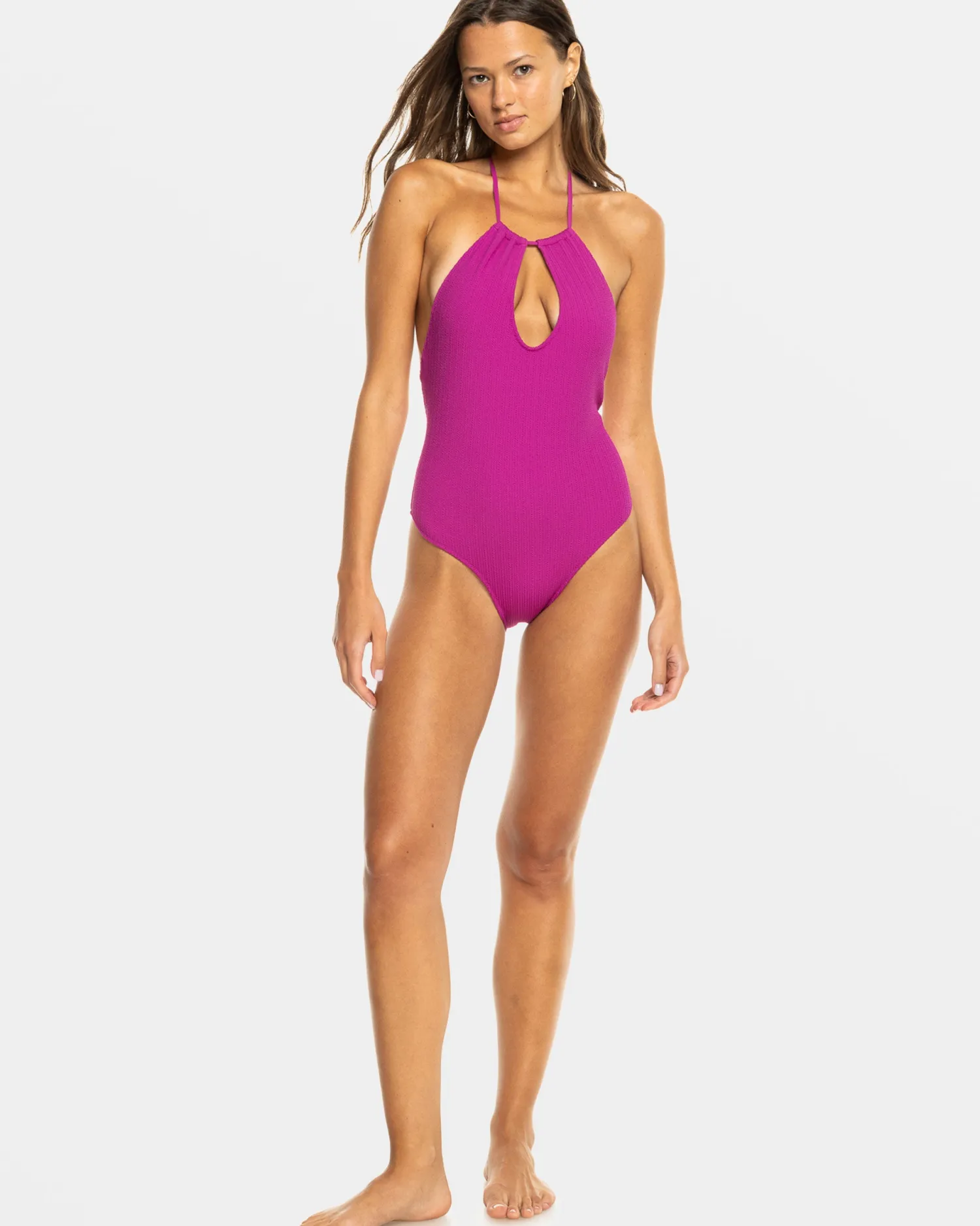 Dive into tropical bliss with the Aruba One Piece Swimsuit from ROXY. Crafted from a soft, stretchy, and partially recycled fabric blend, this halter-neck suit offers medium coverage and regular support for all-day comfort. The keyhole cut out at the neck adds a flirty touch, while the ROXY branding adds signature style. Featured here in the Wild Aster colorway.