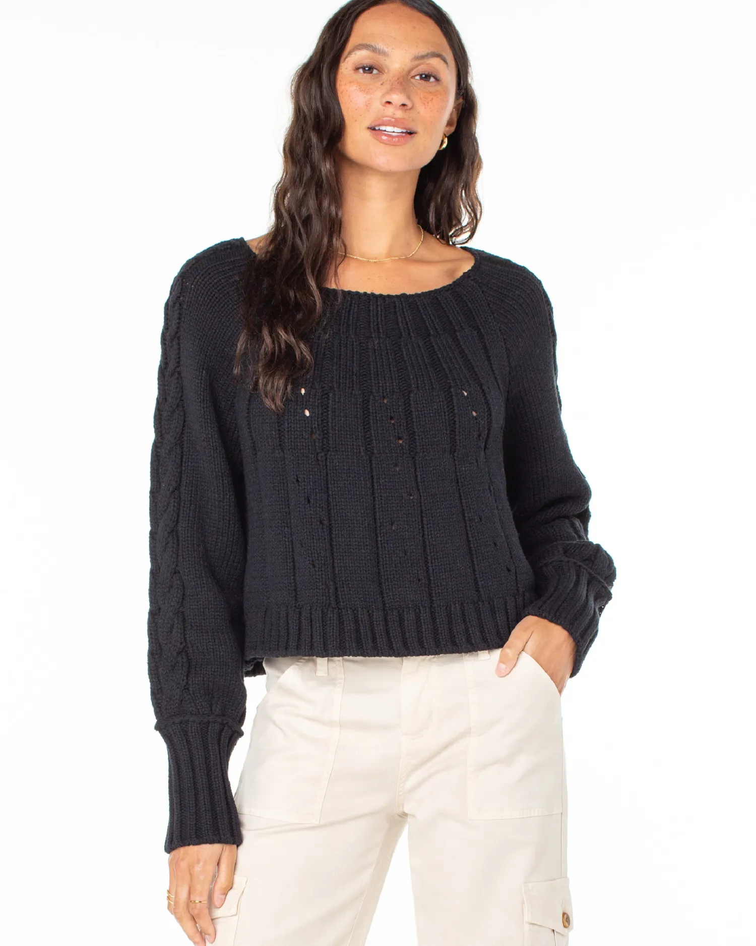 A seaside-inspired, cable knit sweater woven with luxuriously soft cotton-acrylic yarn. Stylish boat neckline and textured knit design evoke laidback, timeless style. Lightweight, breathable comfort for effortless weekends.