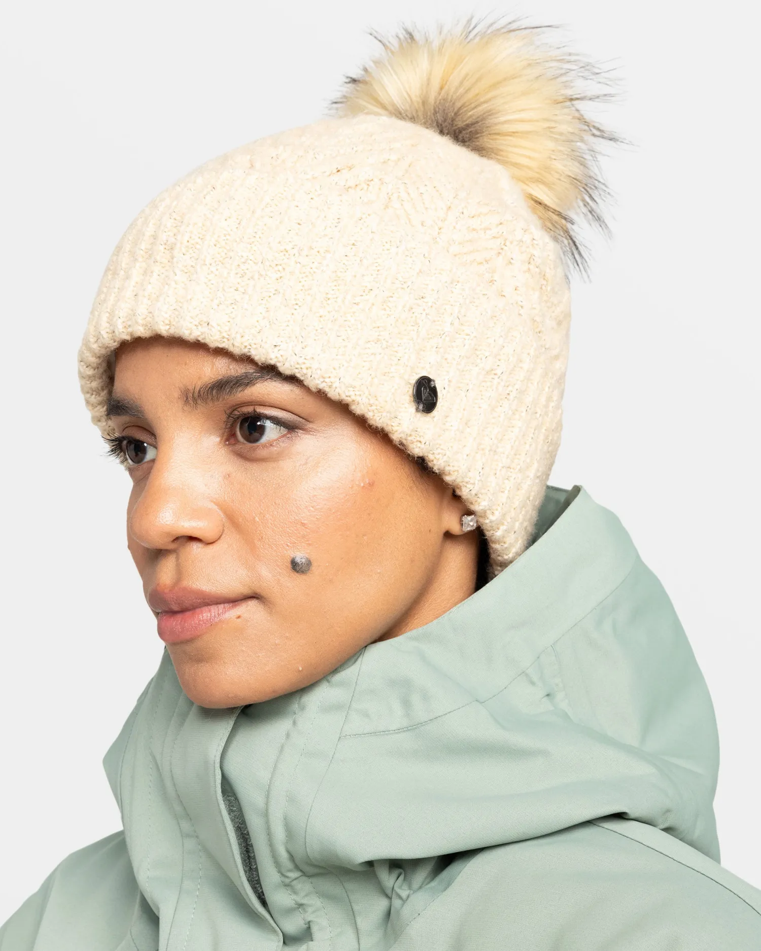 Cozy up in the Peak Chic Cuff Beanie from ROXY. This warm, ribbed beanie features a plush, fleece-lined band and a playful faux fur pom. The soft knit blend keeps you toasty, while the folded fit offers a chic, customizable look. Elevate any outfit with this versatile cold-weather essential. Featured here in the Pebble colorway.