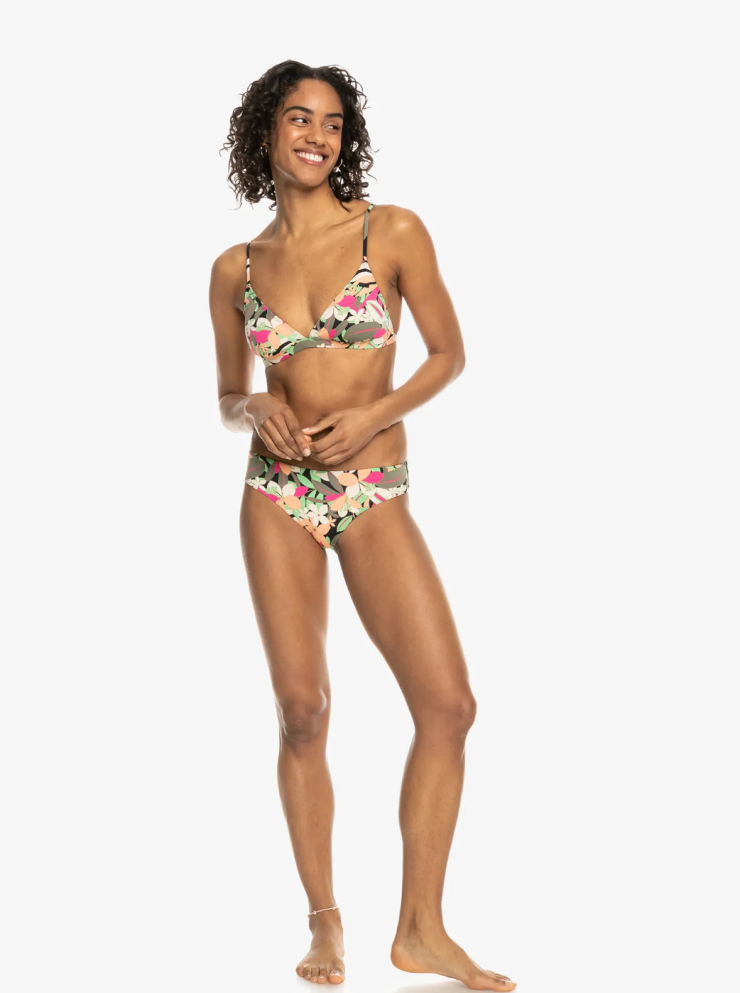 Enjoy the sun in style with this fixed triangle bikini top from ROXY’s Printed Beach Classics Collection. Crafted from a soft, strong and stretchy recycled nylon-blend fabric, this triangle swim top offers regular support, adjustable straps, and removable cups. With its hook closure and adjustable back length, you’ll be sure to find your perfect fit. Featured here in the Anthracite Palm Song S colorway.