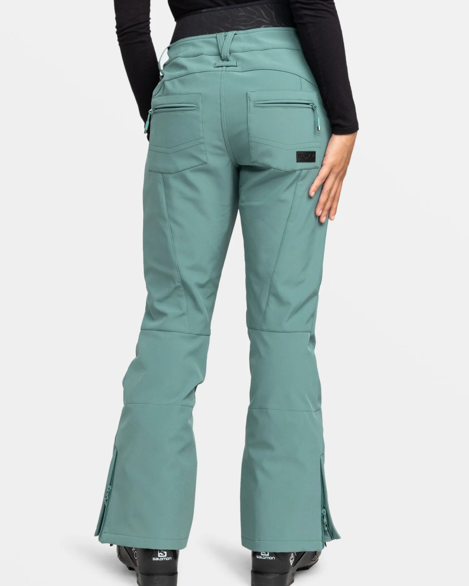 Conquer the slopes in the ROXY Rising High Snow Pant. This skinny-fit pant features high-strength waterproofing, DryFlight tech to keep you moisture-free, plus a cozy brushed fleece lining. The high-rise waistband, jacket-to-pant attachment, and reinforced hem ensure a snug, secure fit for all-day comfort on the mountain. Zipped leg gussets and boot gaiters provide a seamless, customized look. Gear up for epic powder days with this versatile, high-performance pant. Featured here in the Sea Pine colorway.