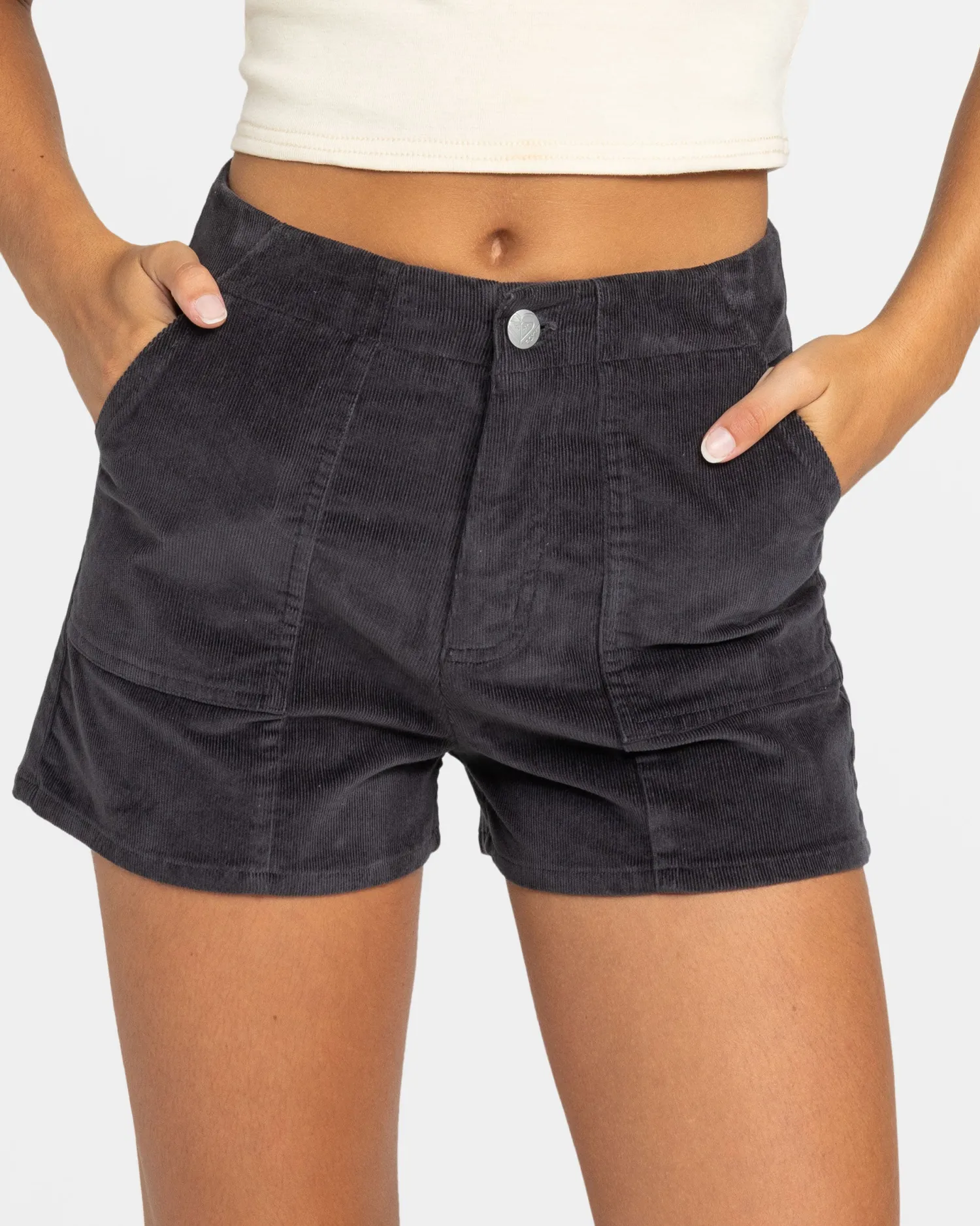 Retro-inspired yet totally now, the Sessions corduroy shorts will become an instant favorite. These high-rise, fitted shorts feature roomy front and back pockets, and ROXY heritage buttons. Style with a crop top for beach-bound style. Featured here in the Phantom colorway.