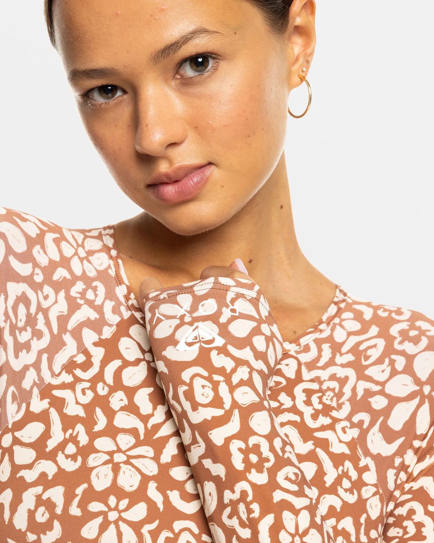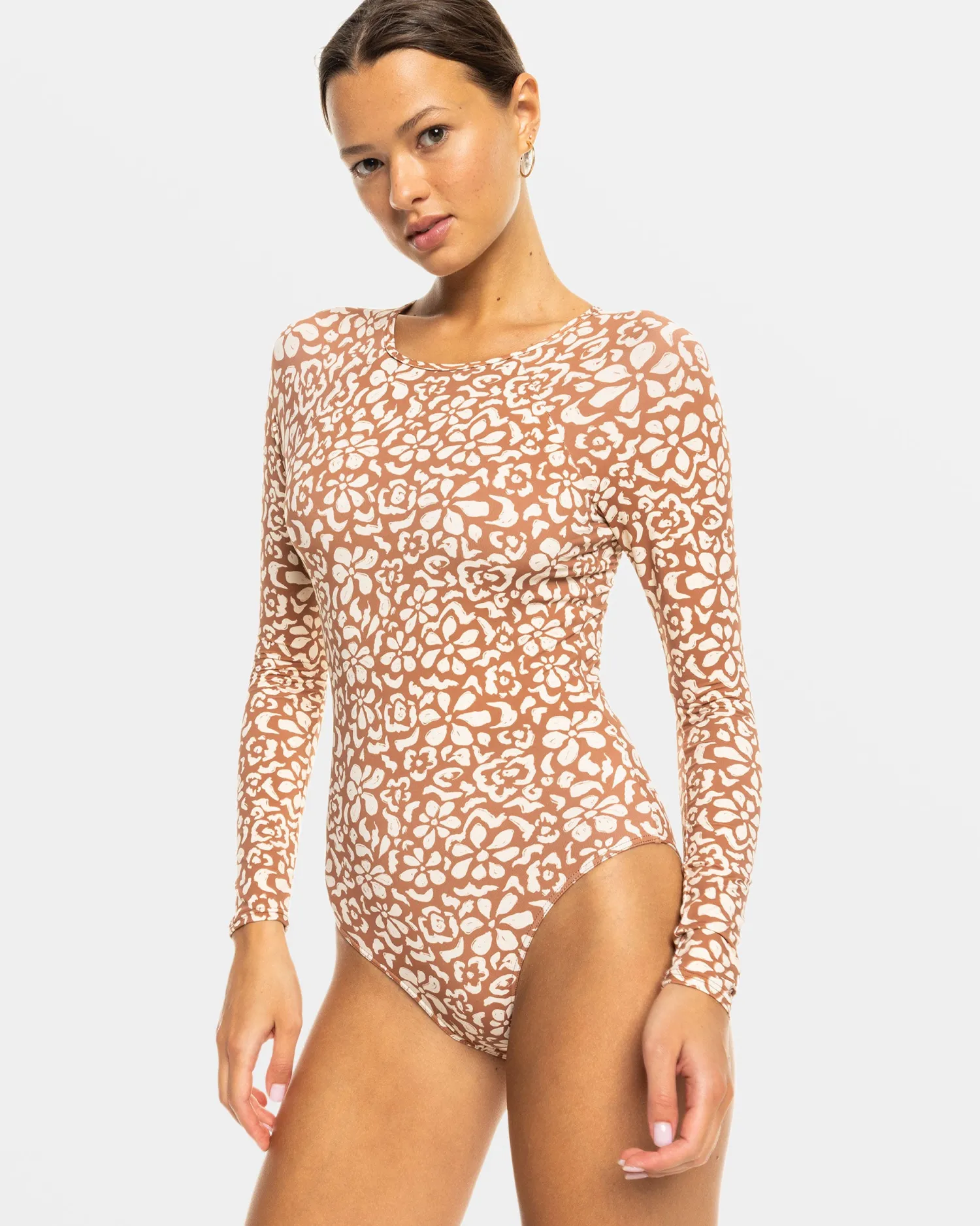 This printed long-sleeve swimsuit from ROXY is actually far from basic. Offering a soft and stretchy feel with its partially recycled nylon-elastane fabric, it offers a figure-hugging, full-coverage fit with a sleek mock neck and raglan long sleeves for a sporty-chic look. Featured here in the Russet Free Fallin Floral colorway.