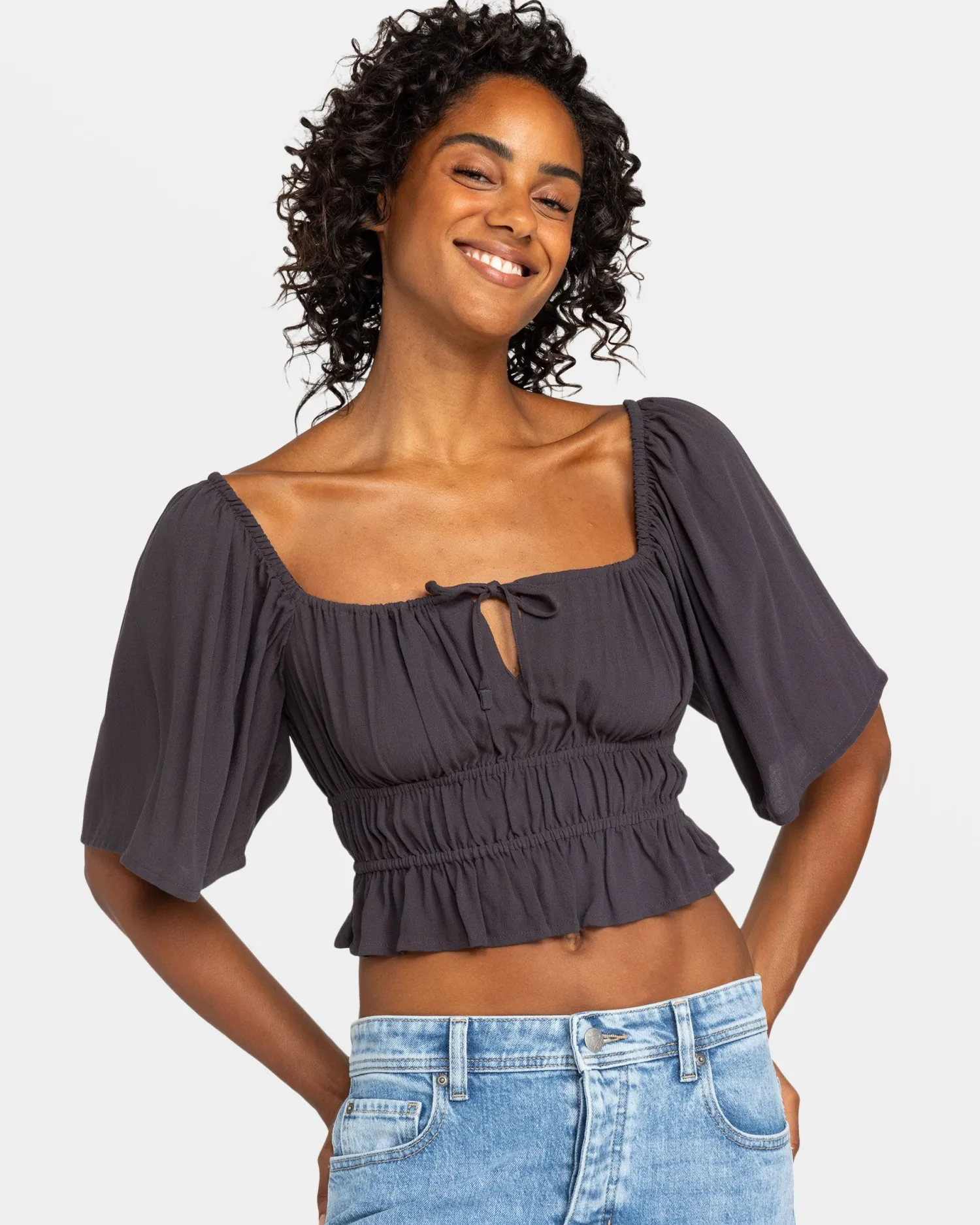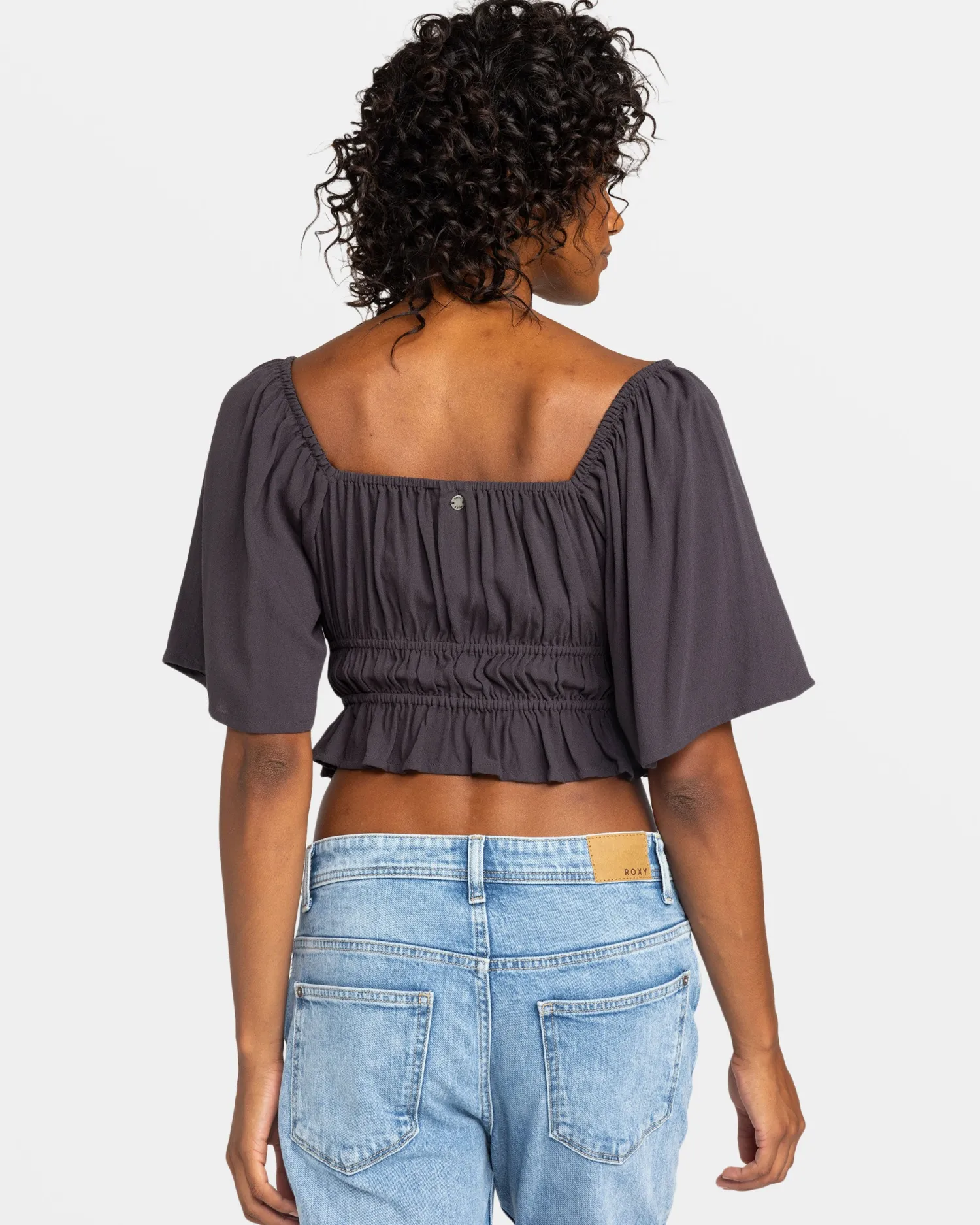Breezy and beautiful, the Dawn Winds Crop Top from ROXY is a must-have for your warm-weather wardrobe. This mid-weight viscose crepe top features a flirty square neckline, flowy short sleeves, and a ruched waist that flatters your figure. Pair it with your favorite high-waisted shorts or jeans for an effortlessly chic look that’s perfect for sunny days and cool nights. Featured here in the Phantom colorway.