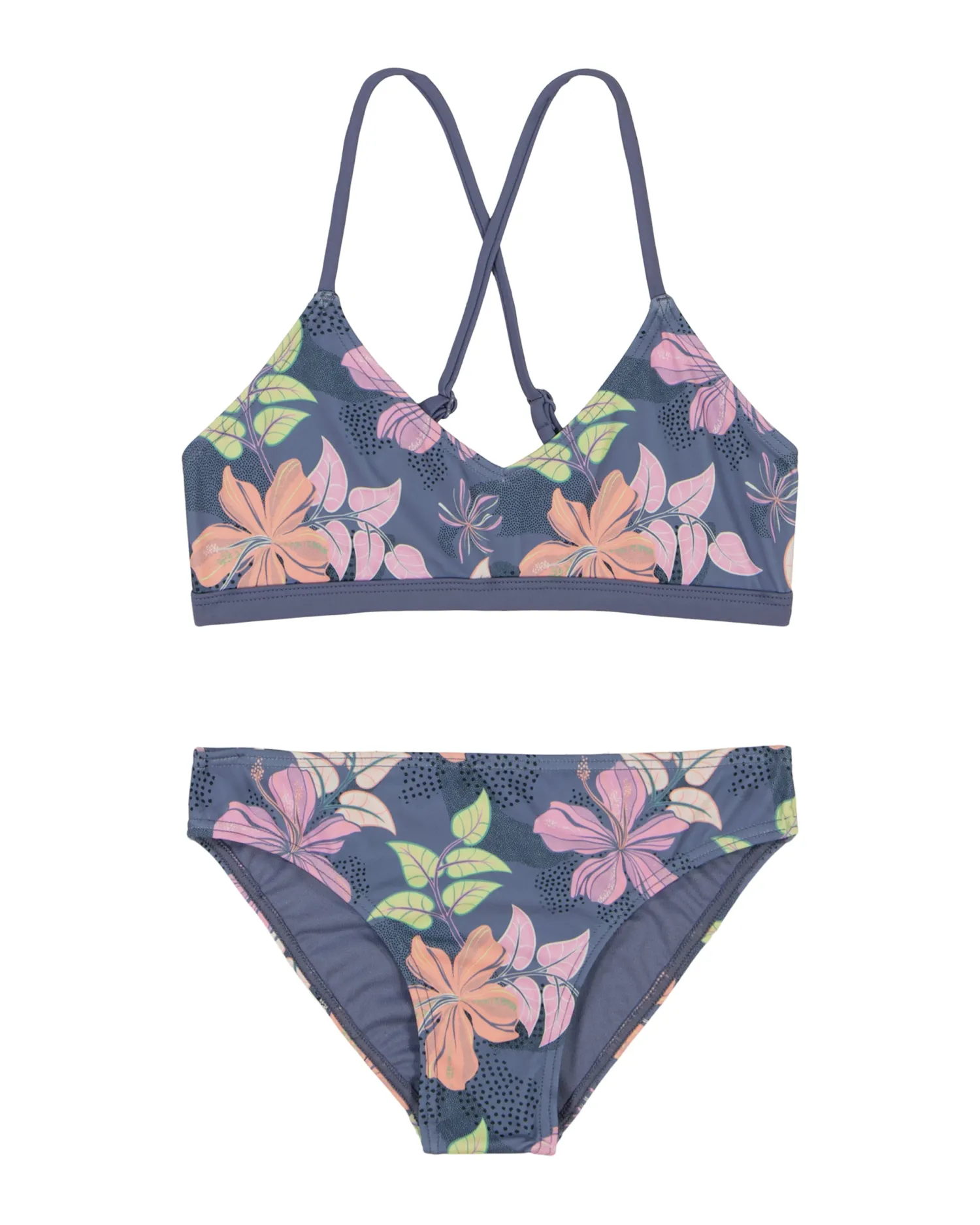 Girls will love this Hidden Garden bikini set from Roxy. The athletic V-neck bralette and bottoms offer medium coverage and stretchy comfort. With an all-over print, adjustable straps, and extra support in larger sizes, it’s perfect for active beach days. Featured here in the colorway.