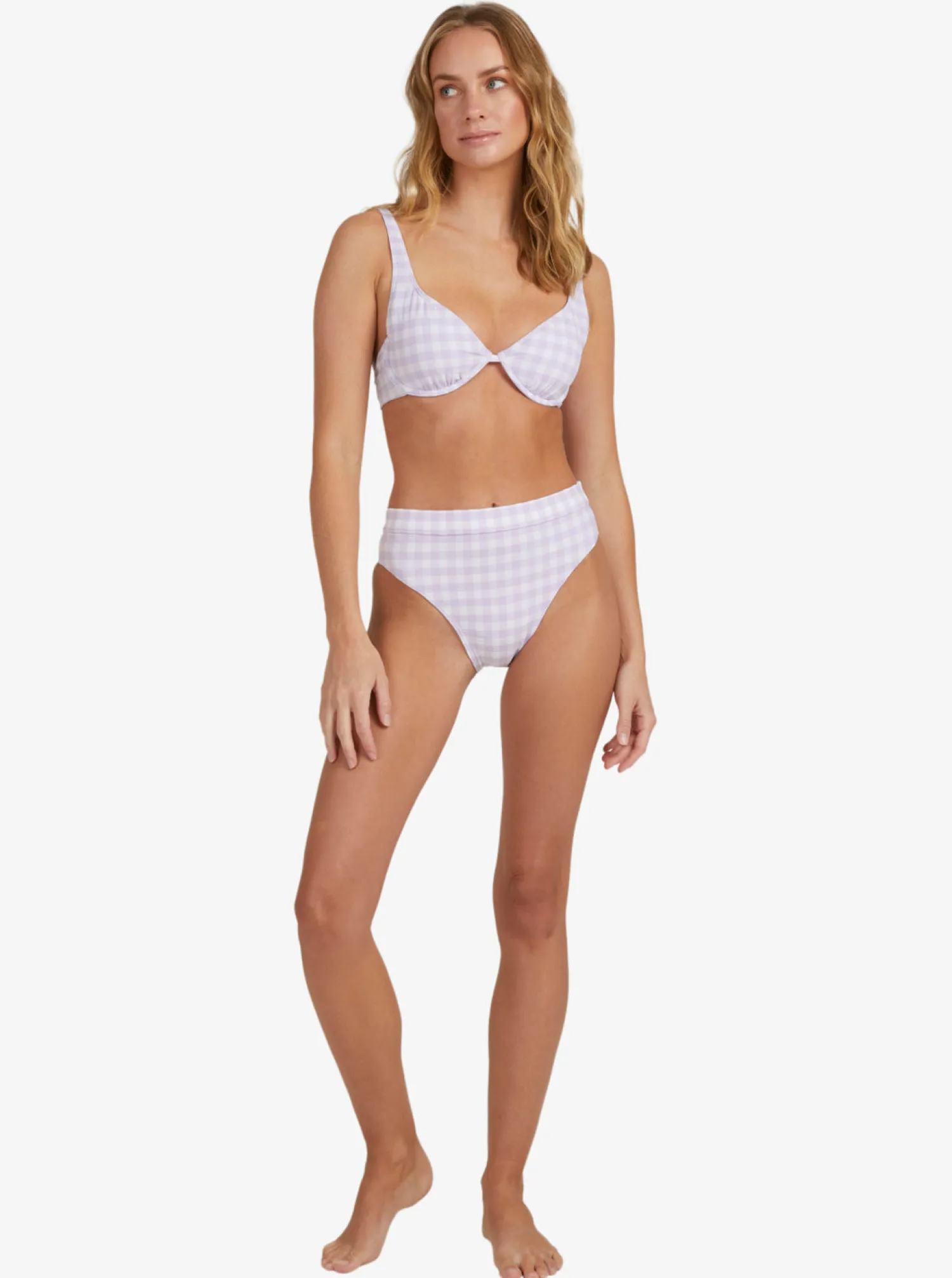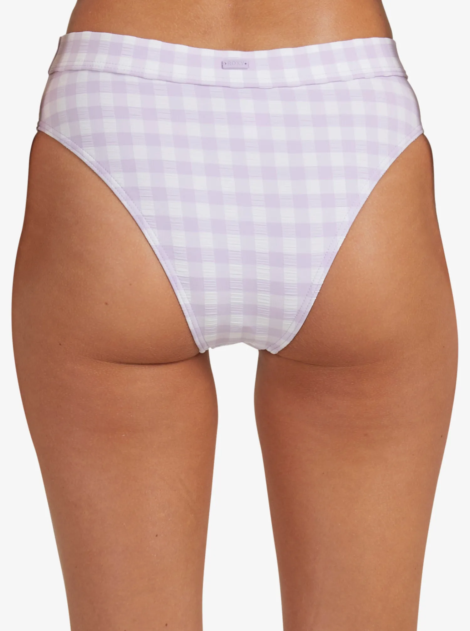 Made of textured swim fabric in a gingham checker print, this mid-rise bikini bottom has a not-too-skimpy, but not-too-full perfectly balanced bum cut. Featured here in the Castle Gingham Lg Pastel Lilac colorway.