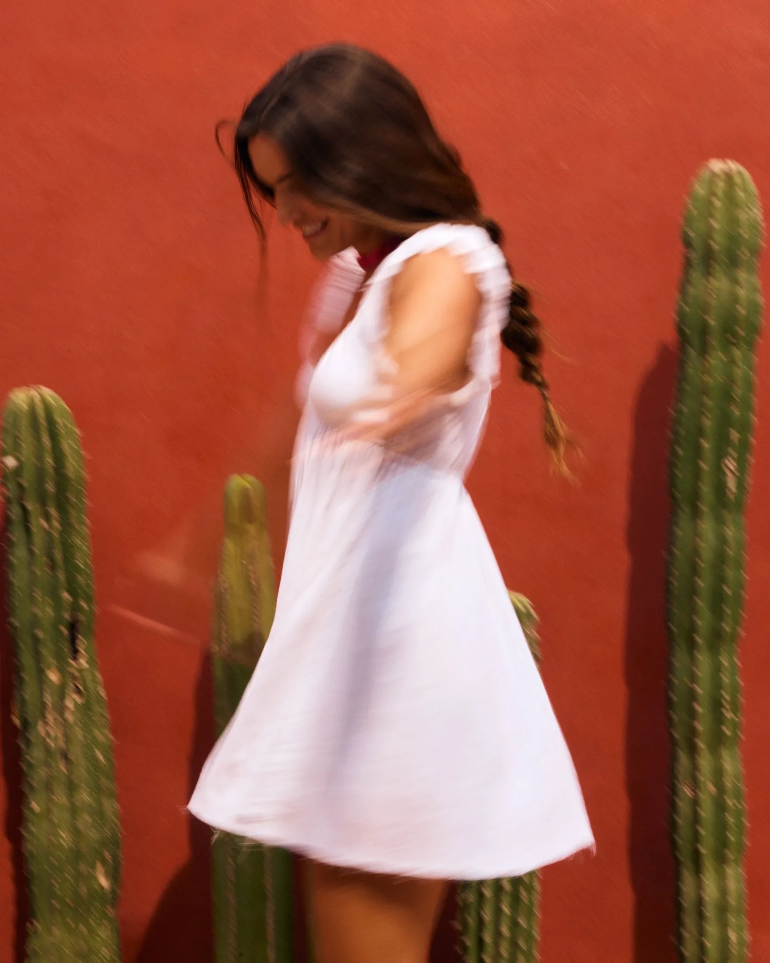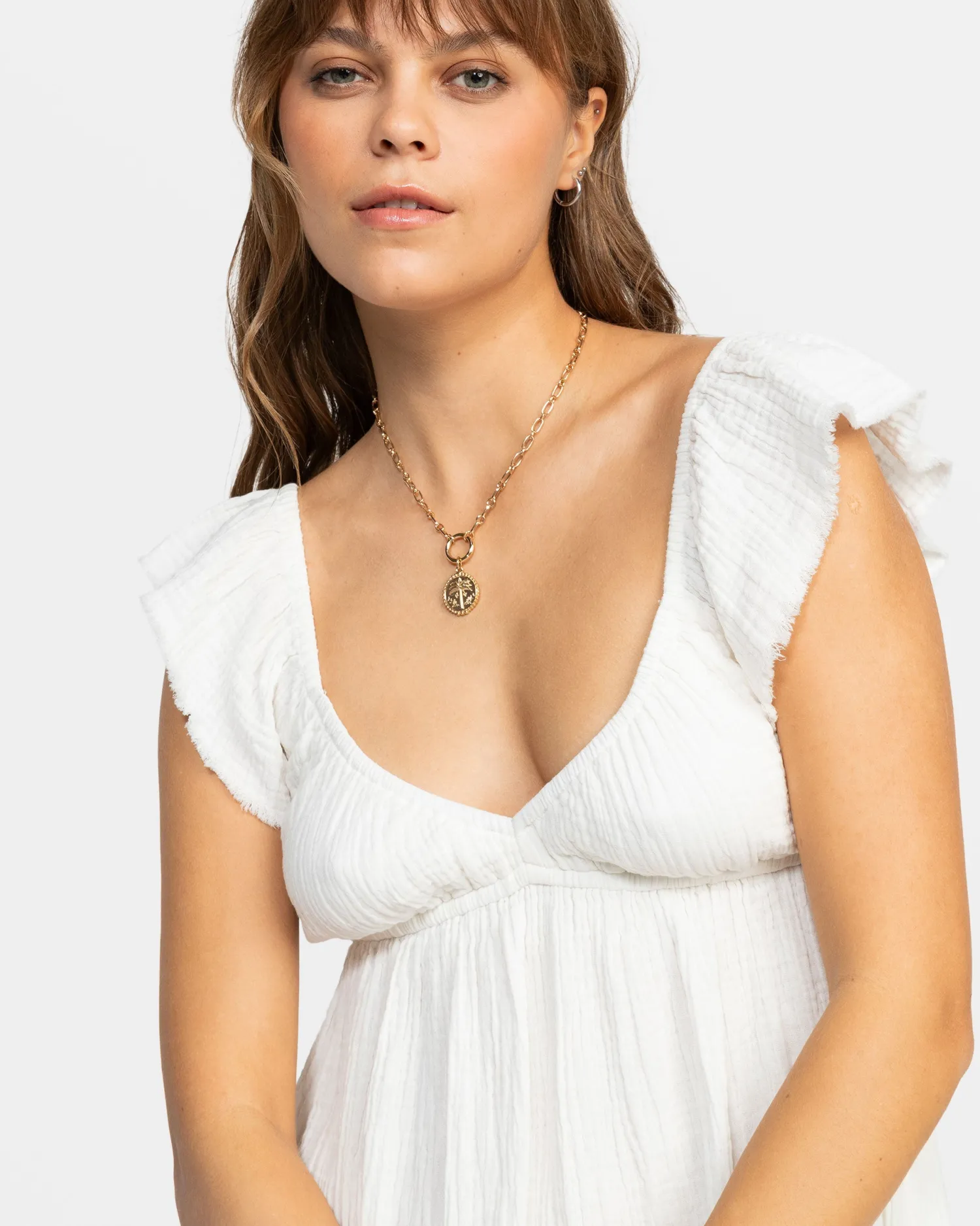 Introducing the Luna mini dress from ROXY. Made with lightweight cotton gauze, this romantic mini dress features sweet flutter sleeves, a fitted bust, and an easy skirt with raw edge detailing for a perfect beachy look. Featured here in the Egret colorway.
