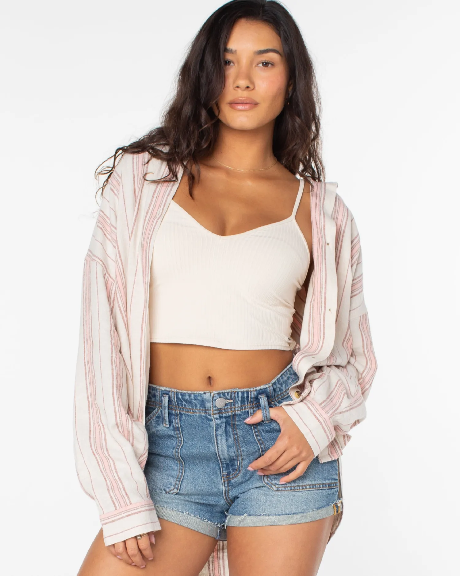 Slide into this airy linen-blend top-the soft woven fabric and relaxed long sleeves embrace your casual morning style. Lightweight, breathable bliss for lounging or weekend errands.
