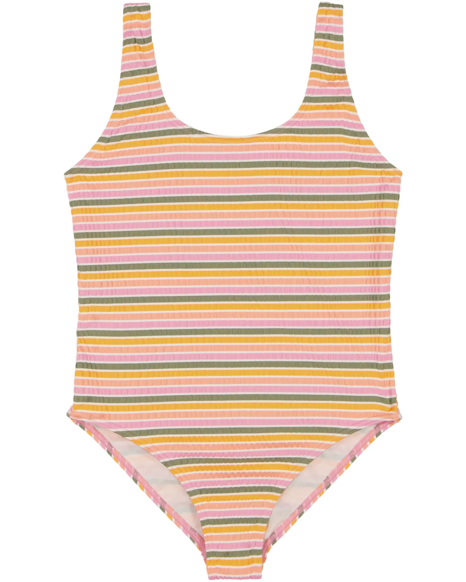 Dive into fall fun with this girls’ striped one-piece from Roxy. The stretchy fabric and fixed straps keep her comfy for all-day beach adventures. With medium coverage and a scoop neck, it’s the perfect blend of style and practicality for young swimmers. Featured here in the colorway.