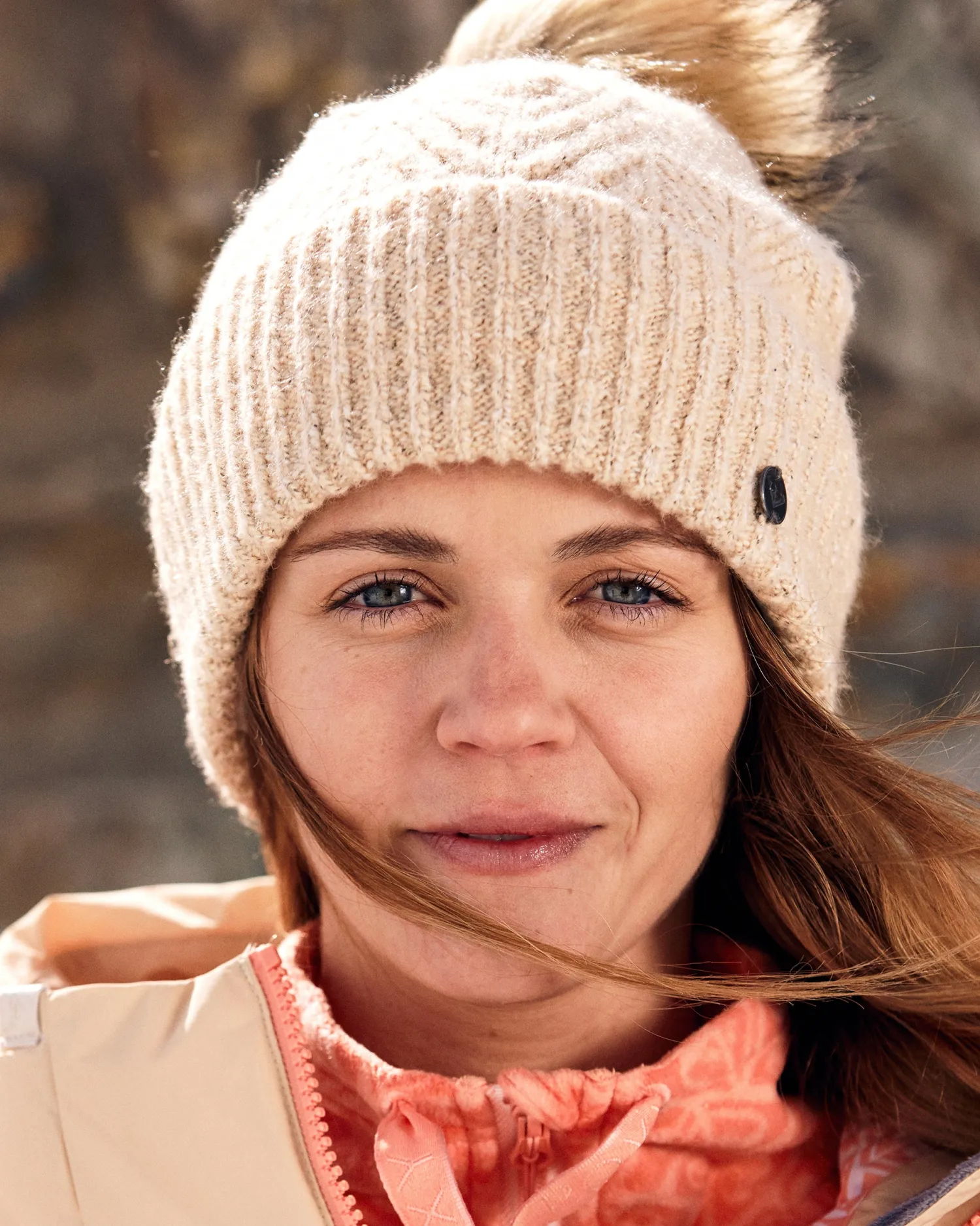 Cozy up in the Peak Chic Cuff Beanie from ROXY. This warm, ribbed beanie features a plush, fleece-lined band and a playful faux fur pom. The soft knit blend keeps you toasty, while the folded fit offers a chic, customizable look. Elevate any outfit with this versatile cold-weather essential. Featured here in the Pebble colorway.