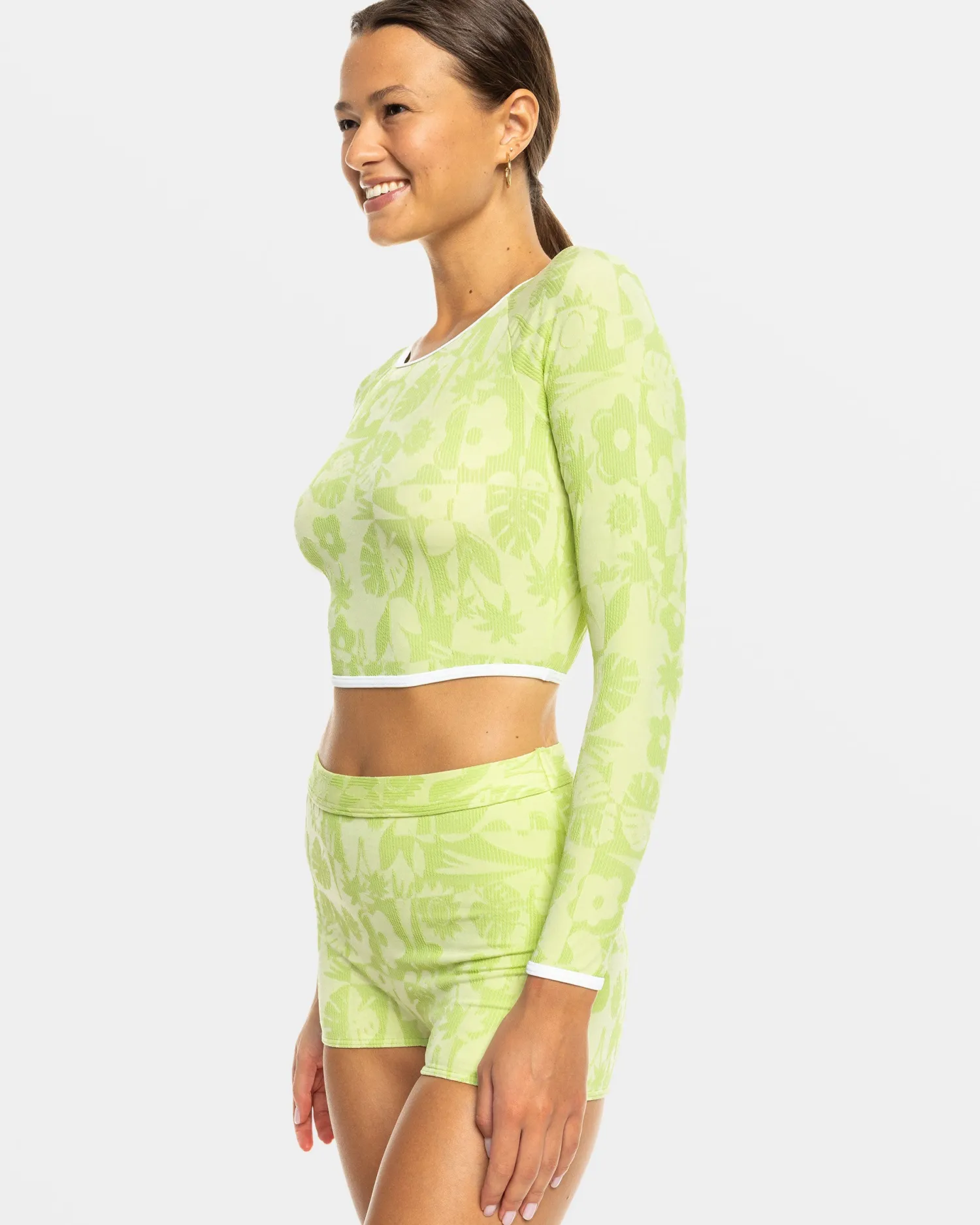 When coverage is key, the Solaria long-sleeve surf top is your perfect companion. Crafted of soft and stretchy partially recycled fabric, this fitted crop top features raglan sleeves for enhanced mobility and classic ROXY branding. A surf-ready essential with style to spare. Featured here in the Tomatillo colorway.